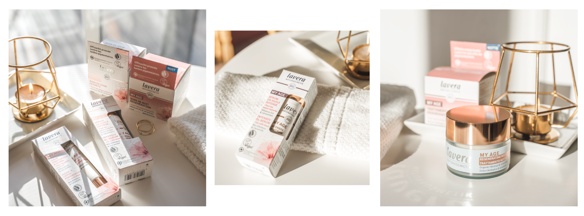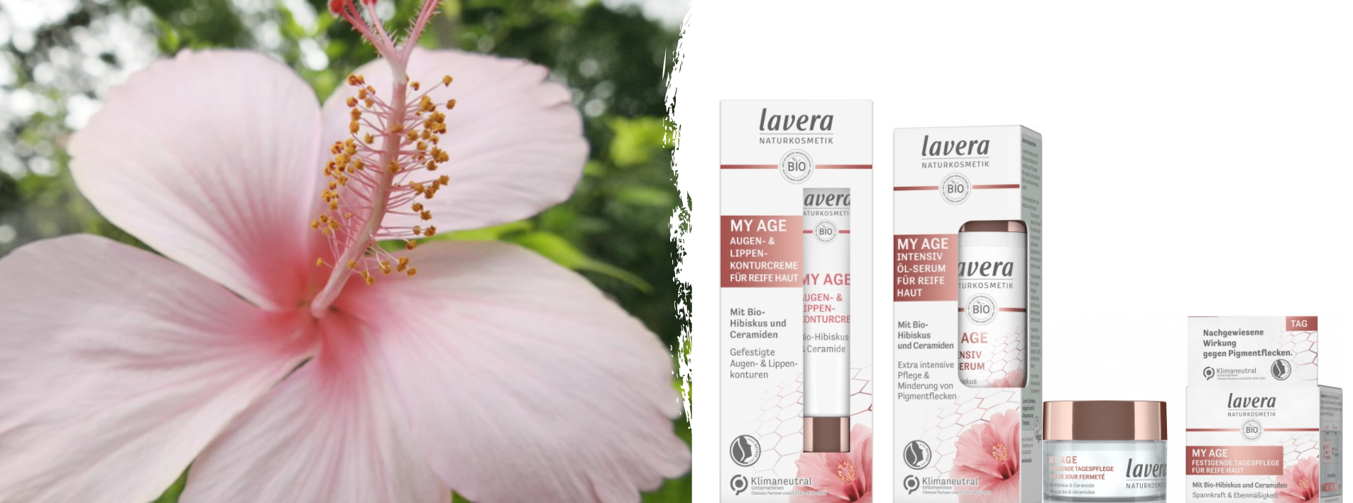 100% certifikovaná přírodní kosmetika lavera přináší na trh novou řadu kosmetických produktů My Age, která nabízí ideální koktejl účinných látek pro péči o zralou pleť. Její tajemství se ukrývá v pečlivě vyváženém složení s obsahem Bio Ibišku a přírodních ceramidů. Tato kombinace účinných látek minimalizuje vrásky, pleť důkladně vyživí a zajistí její pevnost a pružnost.