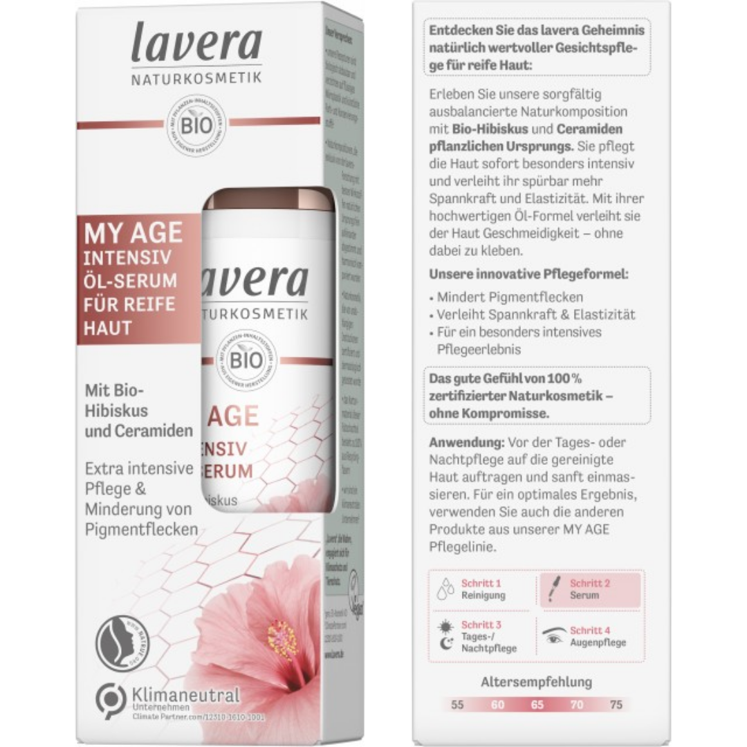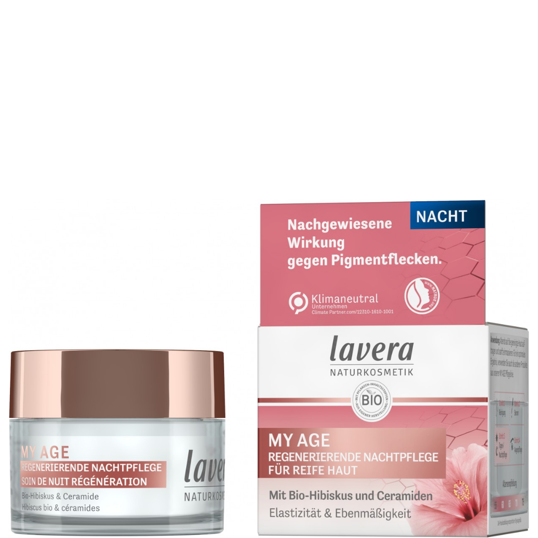 100% certifikovaná přírodní kosmetika lavera přináší na trh novou řadu kosmetických produktů My Age, která nabízí ideální koktejl účinných látek pro péči o zralou pleť. Její tajemství se ukrývá v pečlivě vyváženém složení s obsahem Bio Ibišku a přírodních ceramidů. Tato kombinace účinných látek minimalizuje vrásky, pleť důkladně vyživí a zajistí její pevnost a pružnost.